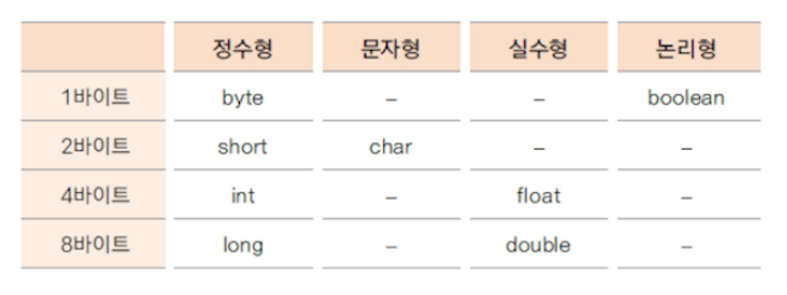 - byte: 1바이트 단위의 자료형으로 동영상, 음악파일 등을 처리할 때 사용하기 좋은 자료형