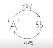 => 인코딩: 각 문자에 따른 특정한 숫자 값(코드 값)을 부여하는 것
