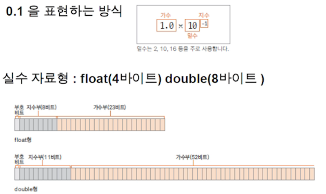- 부동 소수점 방식: 무한의 실수를 표현하기 위해 실수를 지수부와 가수부로 표현한다.
