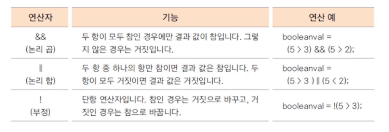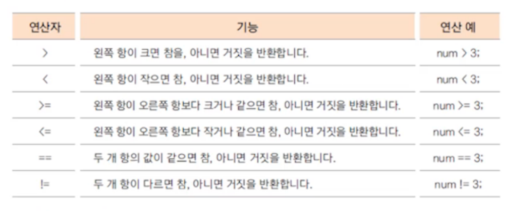 - 연산의 결과가 true(참), false(거짓)으로 반환 됨