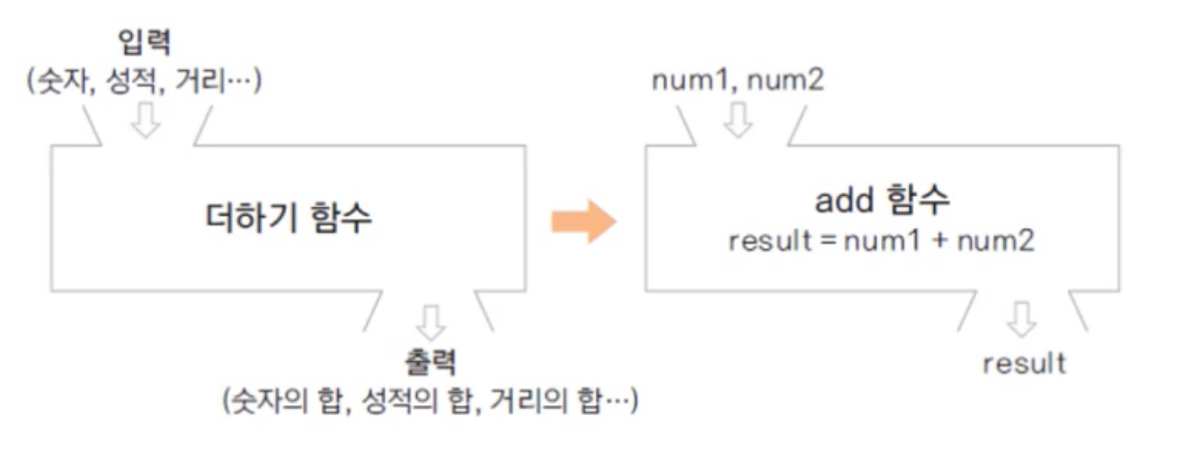 - 하나의 기능을 수행하는 일련의 코드로 중복되는 기능을 함수로 구현하고 호출하여 사용한다