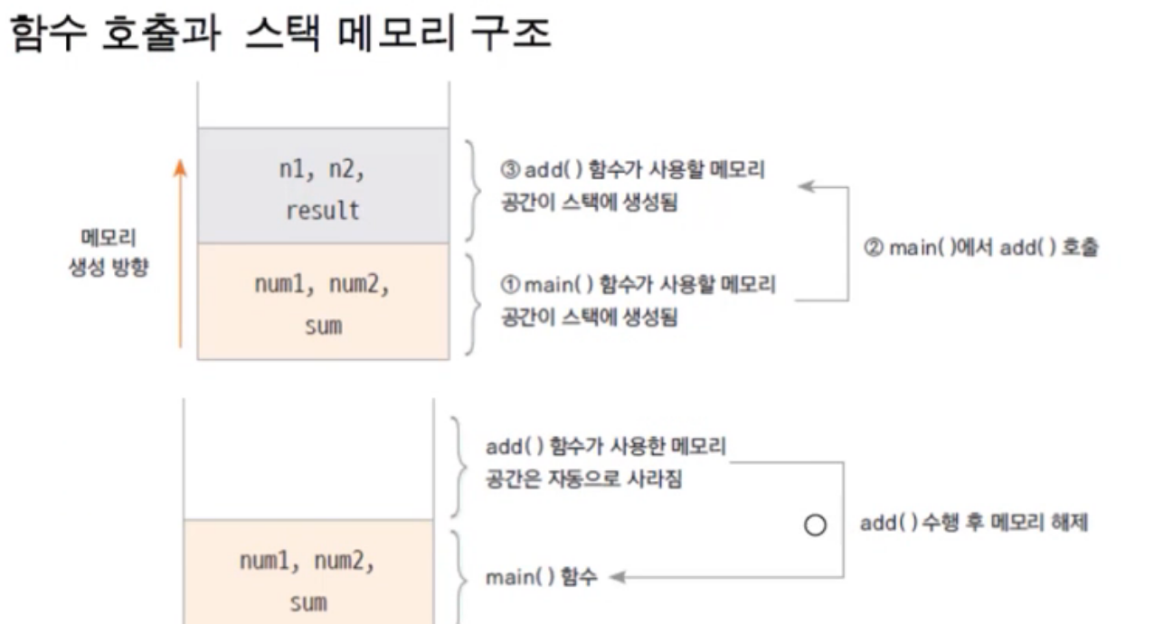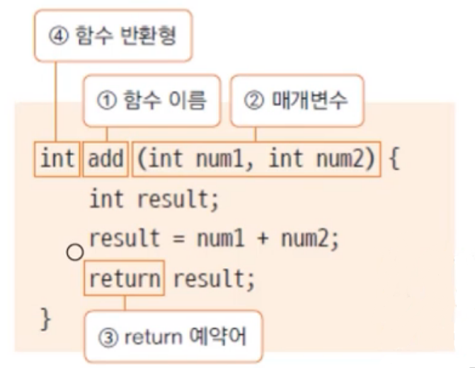 - 함수 반환형: 반환 값의 자료형을 나타내며 반환 값이 없을 경우 void라고 씀